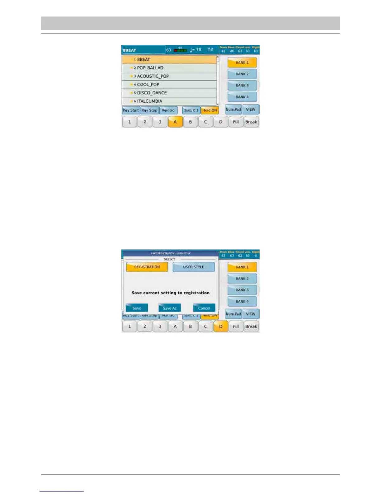 O instrumento coloca à disposição 4 bancos em cada um dos quais o utilizador pode guardar até 1024 Registrations.