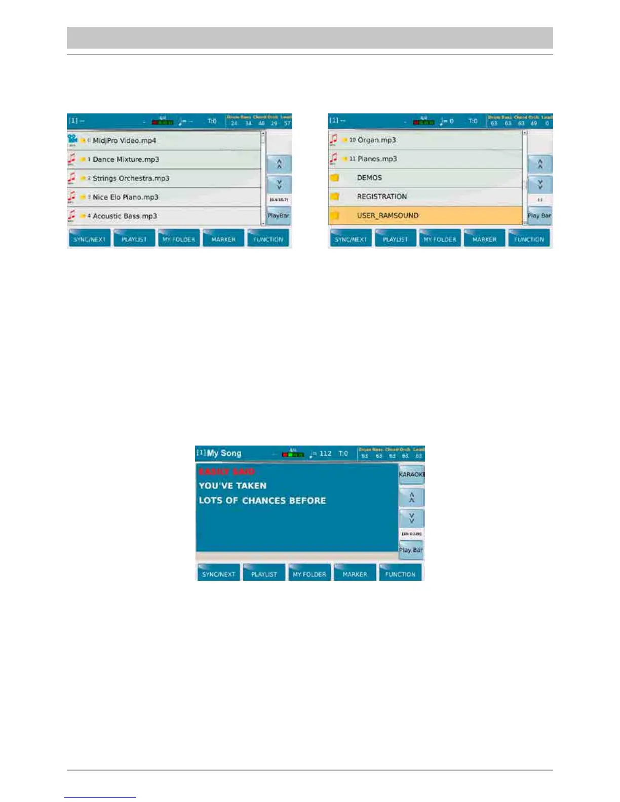 N.B.: when the Auto Play function on the FUNCTION menu (at the bottom on the right) is enabled, the songs