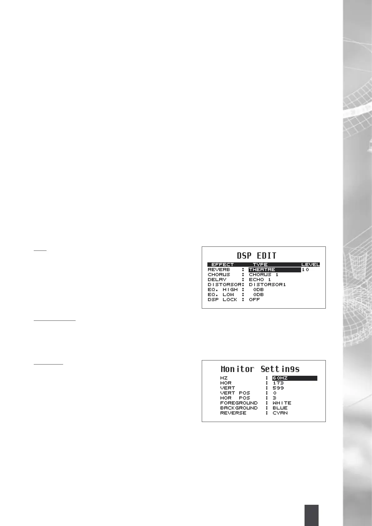 • MONITOR: Some settings of the RGB (Red Green Blue)