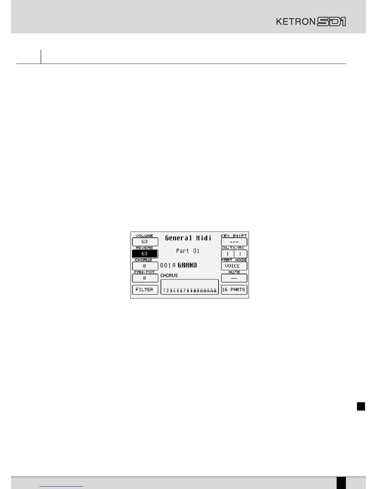 ification page of the parameters for each single MIDI part is enabled using F1 GM from the main page of the display. The parameters modified