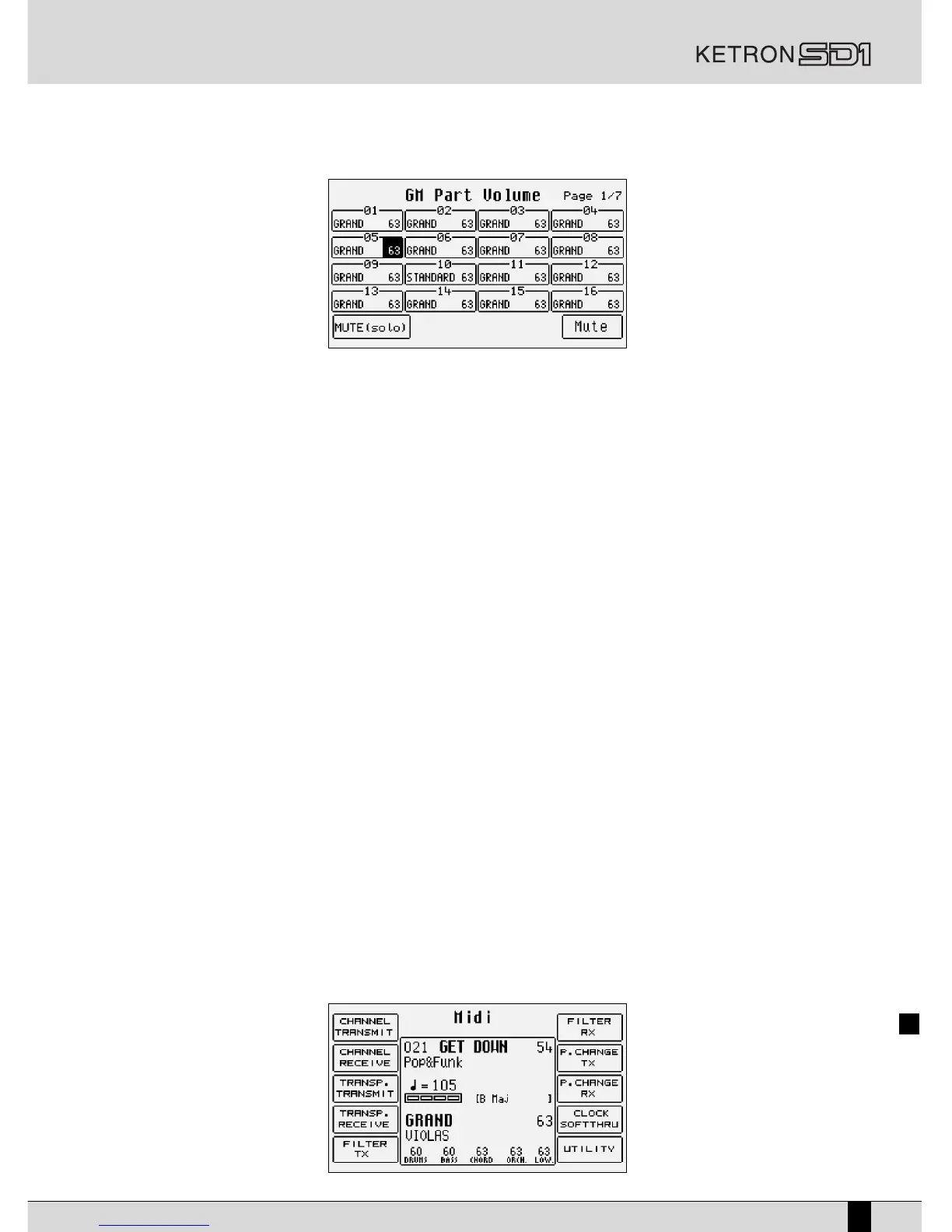 From the main page of the display press F6 MIDI to call up the menus dedicated to the SD1 sections. For each single function the single sec-