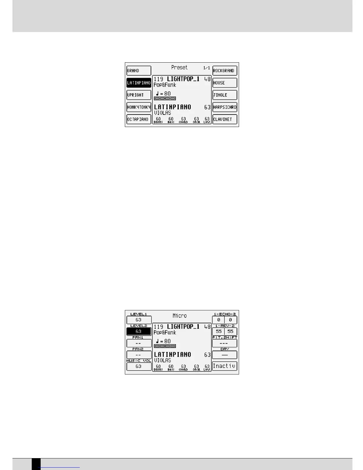 5 timbres appear on the right and five on the left. To call one up simply press the function push button at the sides of the display (F1-F10) rel-