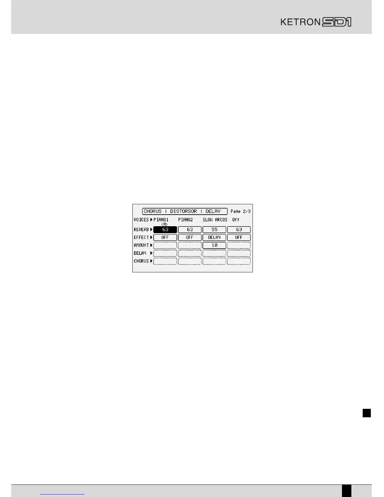 unit with distortion, chorus and delay algorithms combined in five different ways. When the Effect is enabled on a Voice, the musician must also