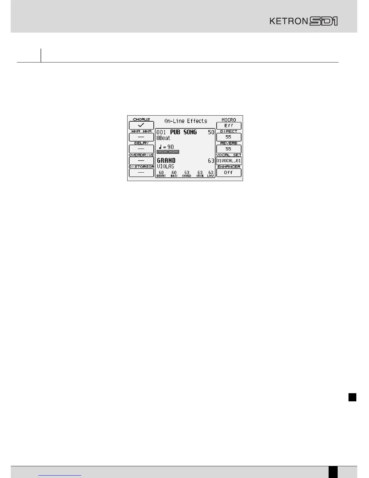 The ON LINE EFFECT push button calls up a menu dedicated to managing the effects for the Voices used in the Right section, namely the lead.