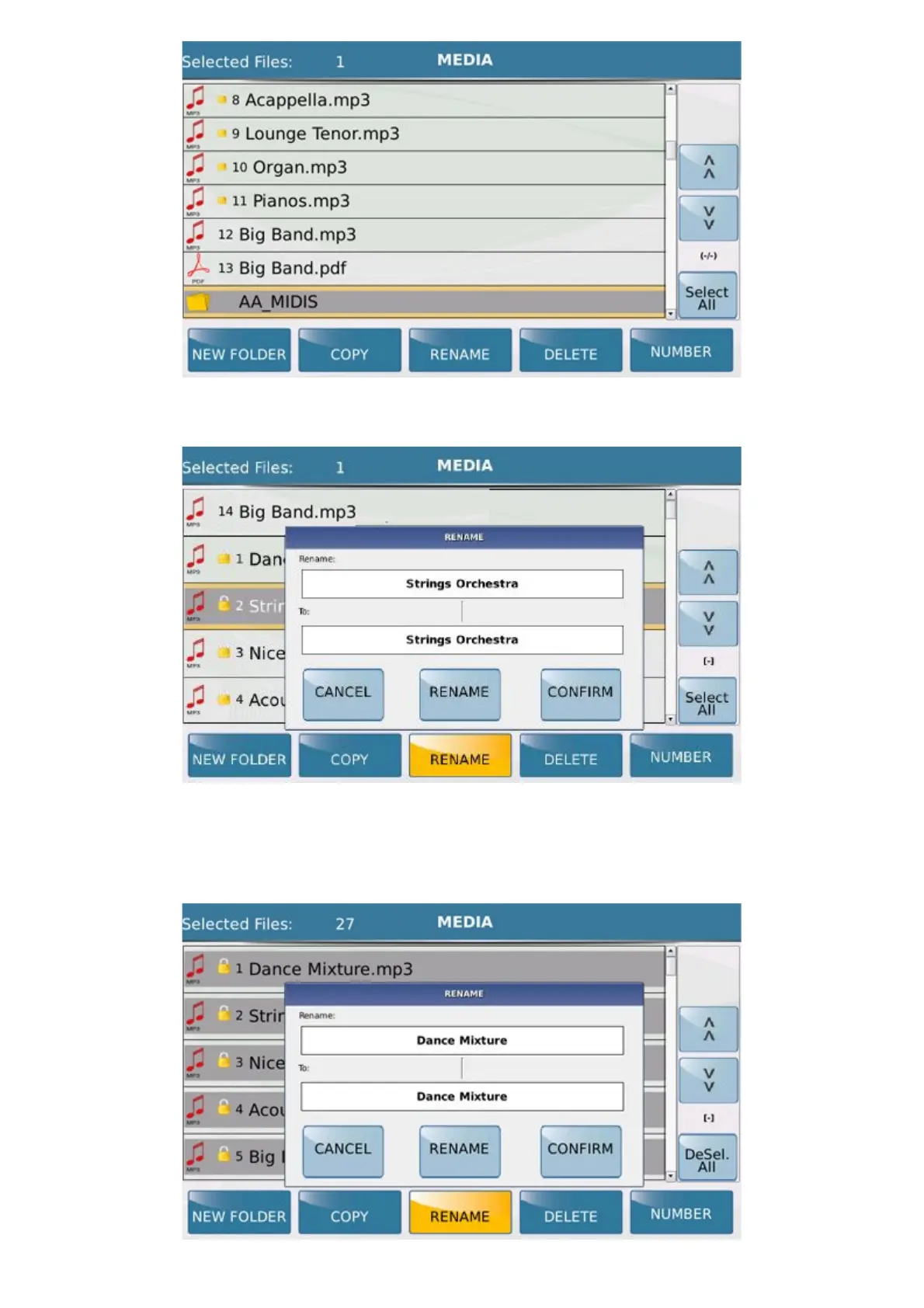 pressing CONFIRM. The correct name of the file or current names of the files selected are displayed in the Rename