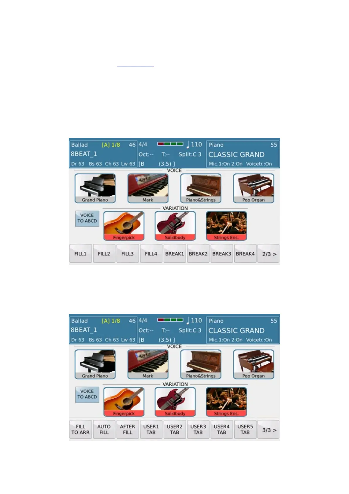 VOICE & VARI : This tab allows you to access (or exit) from the selection menu sounds (Voice and