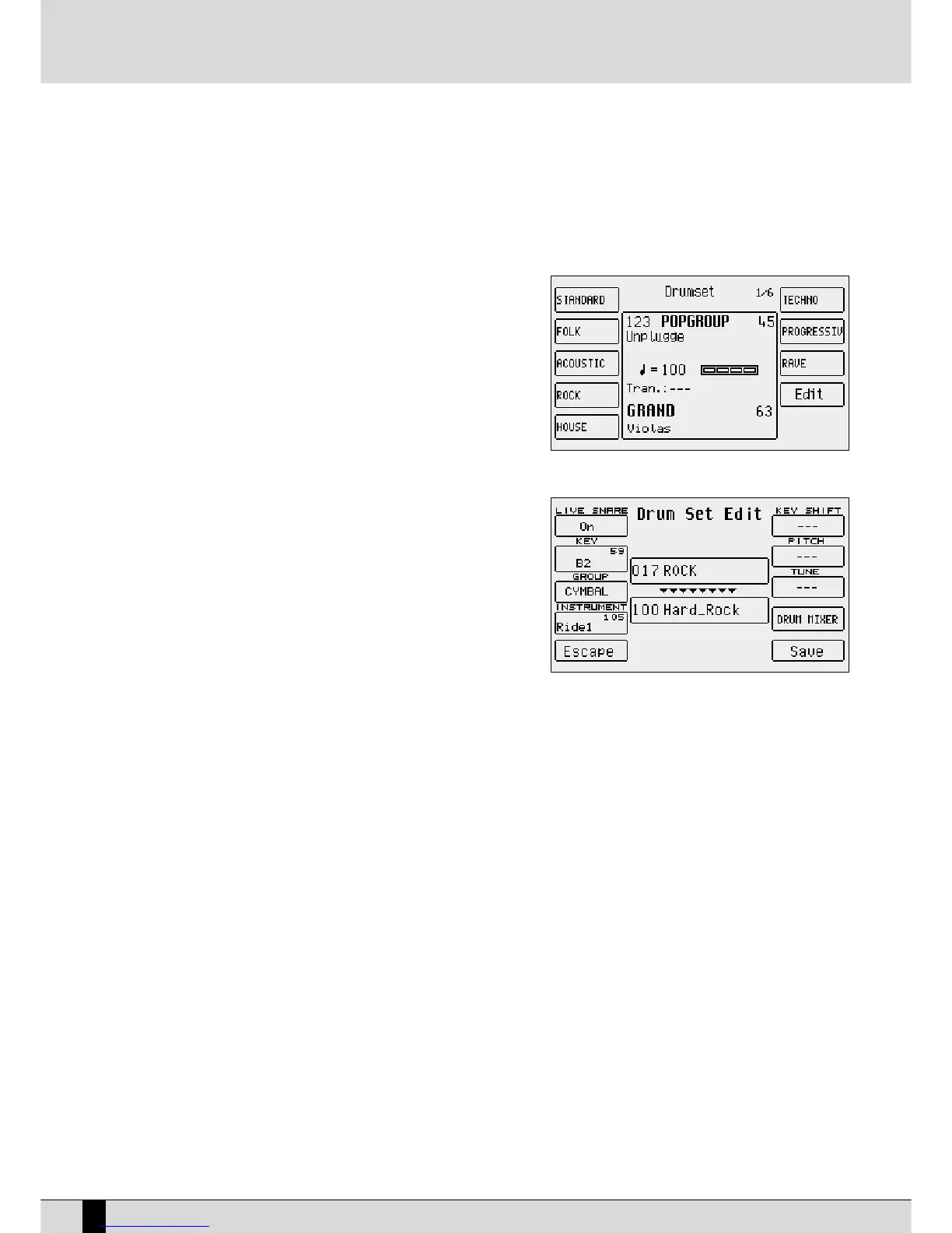F10 Save: Calls up the storage page, where to enter the name of the modified Drum Set using the keyboard keys and the