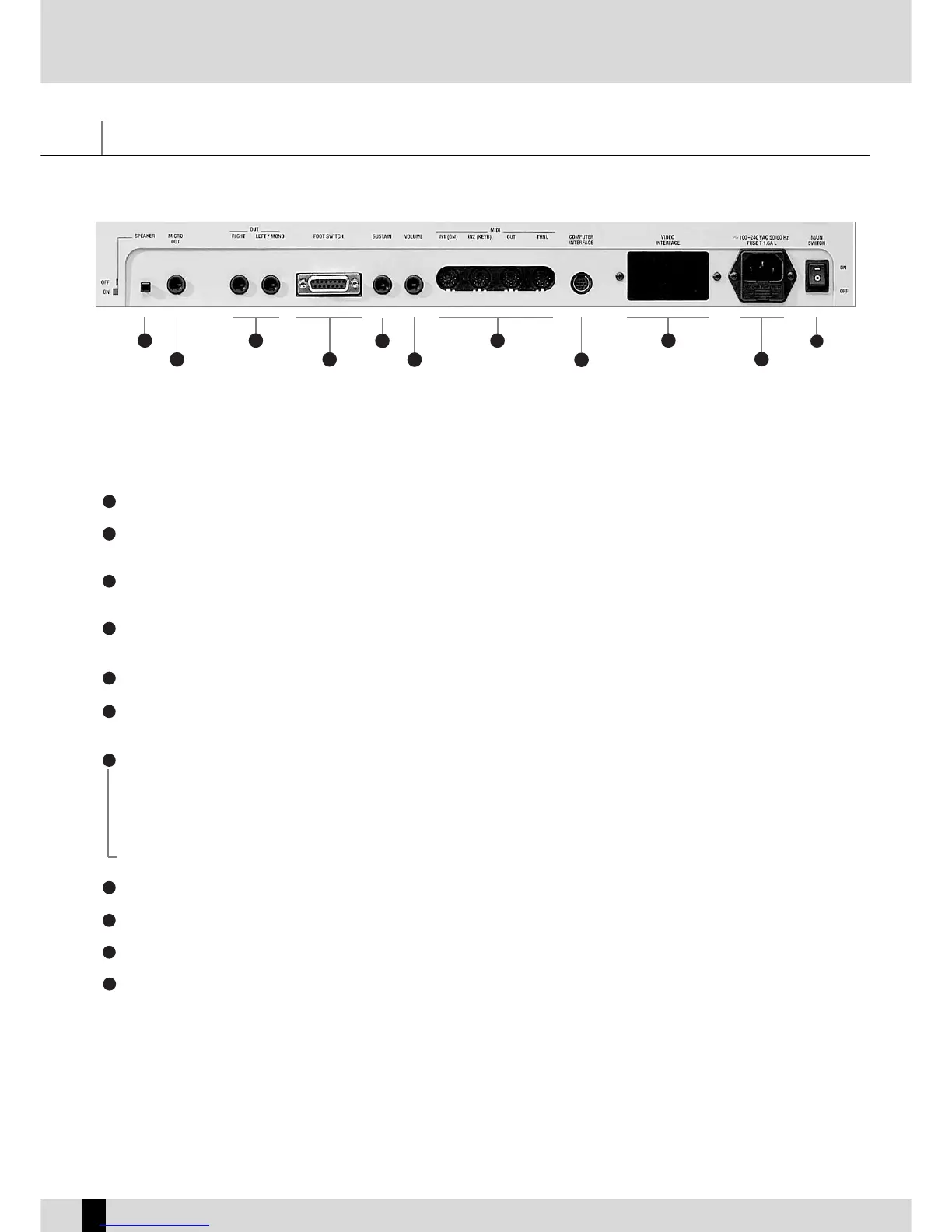 VOLUME PEDAL: This is the socket for the continuous Volume control pedal. It is advisable to use pedals produced by Ketron to avoid dan-