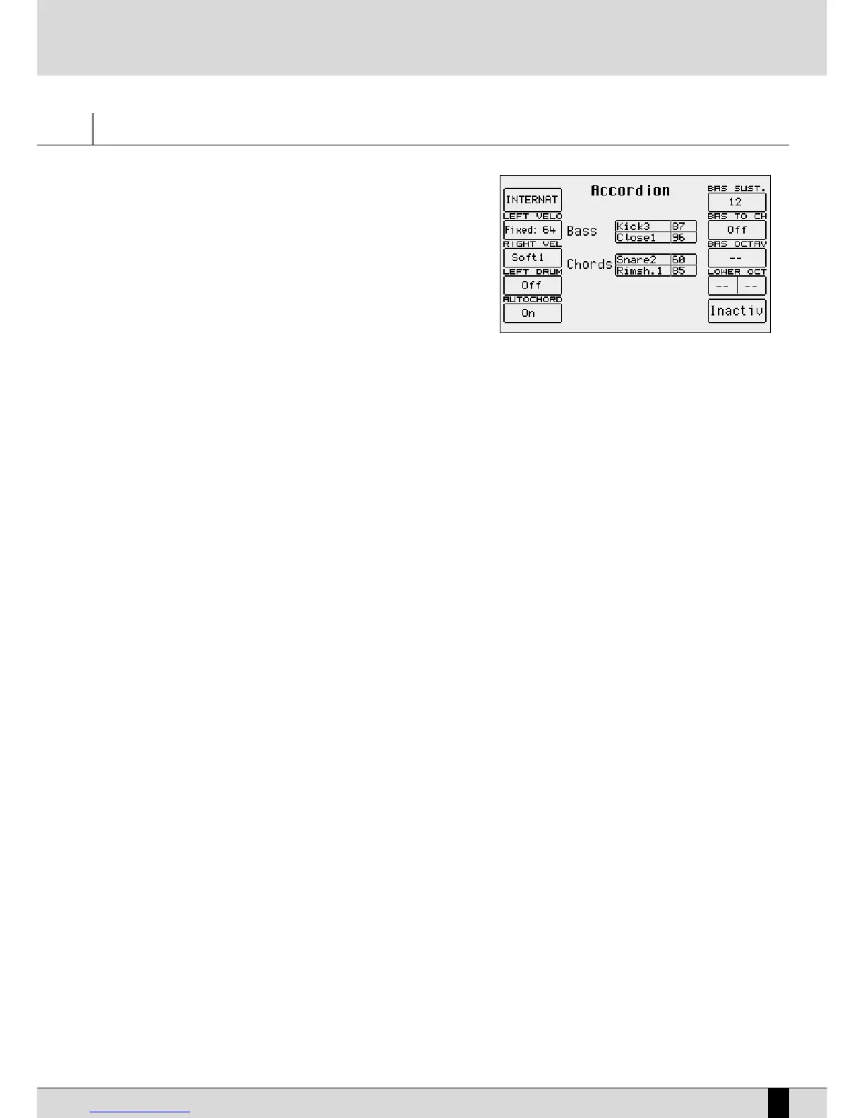F2 Left Velo: This selects the velocity curve for the notes played manually using the chords of the Accordion. By pressing the