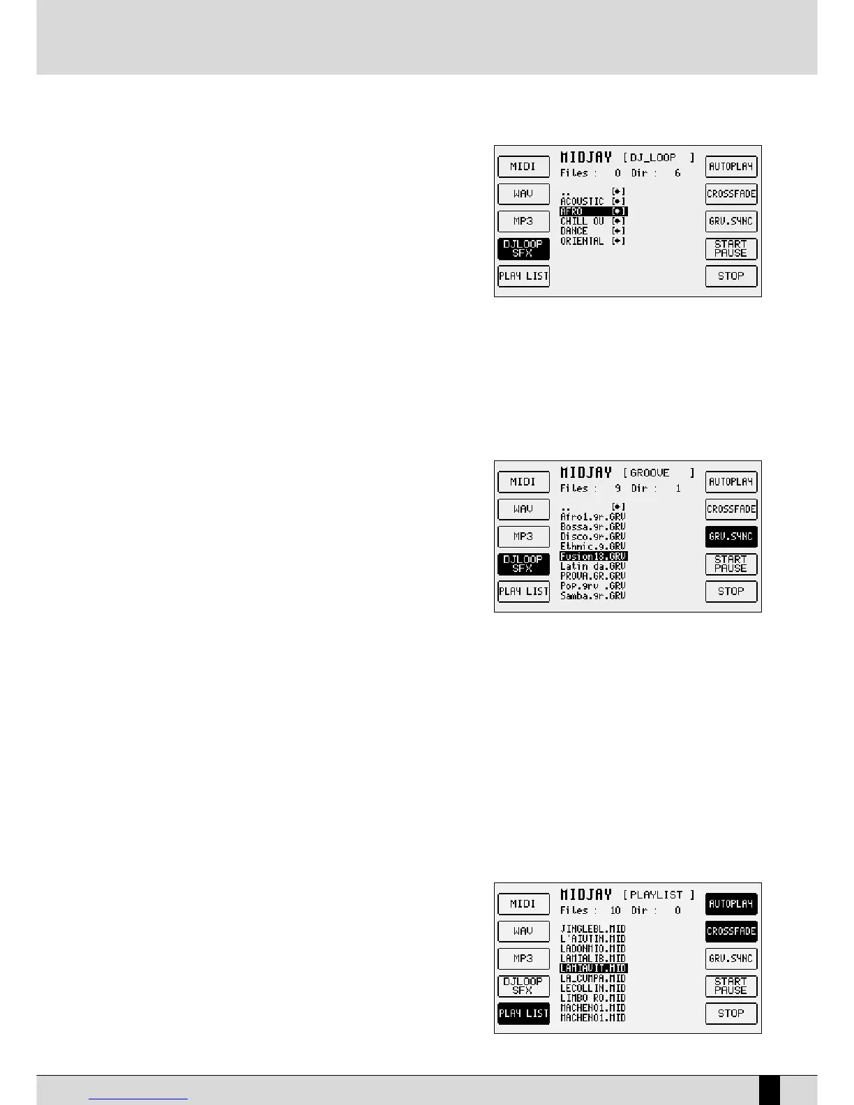 The MidJay allows you to organise the various songs, whether they be MP3's, Waves or Midi's , in groups of ten songs each, called Play Lists. The