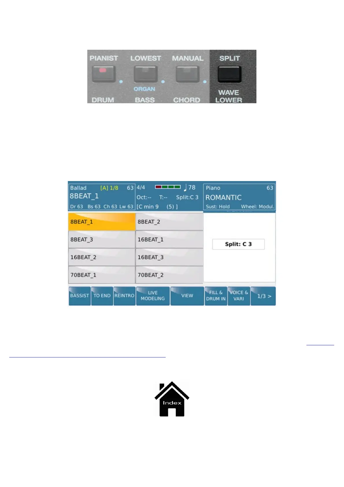 SPLIT: Selecting this tab and pressing a note on the keybed, Split area is determined from Lower section (left)