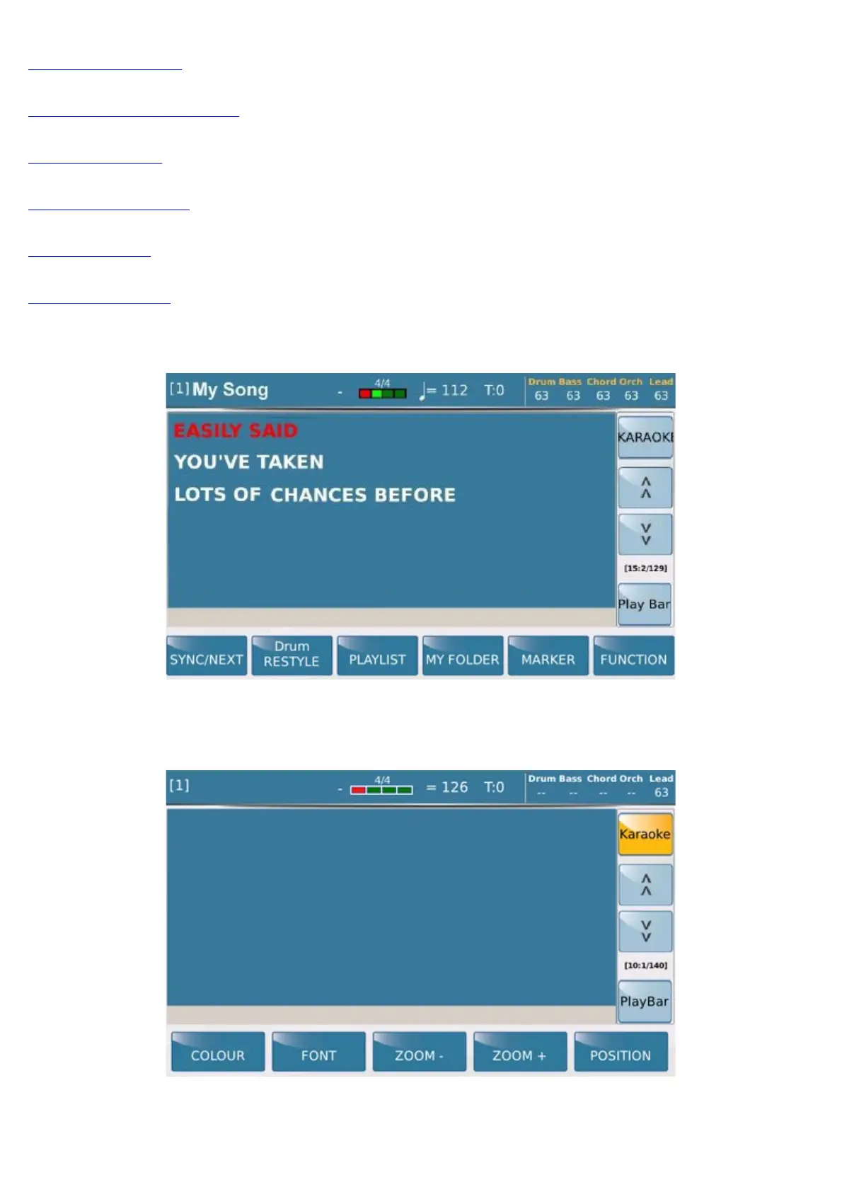 If the file you are playing contains lyrics, a KARAOKE key appears in the right hand box at the top. When you