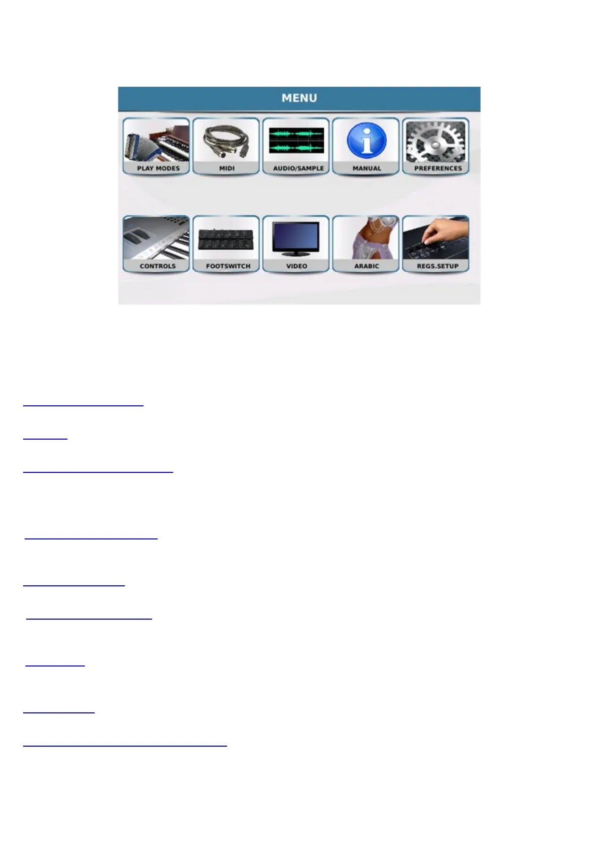 - CONTROLS: Opens a page on which you may set the main parameters such as output volume tone etc..