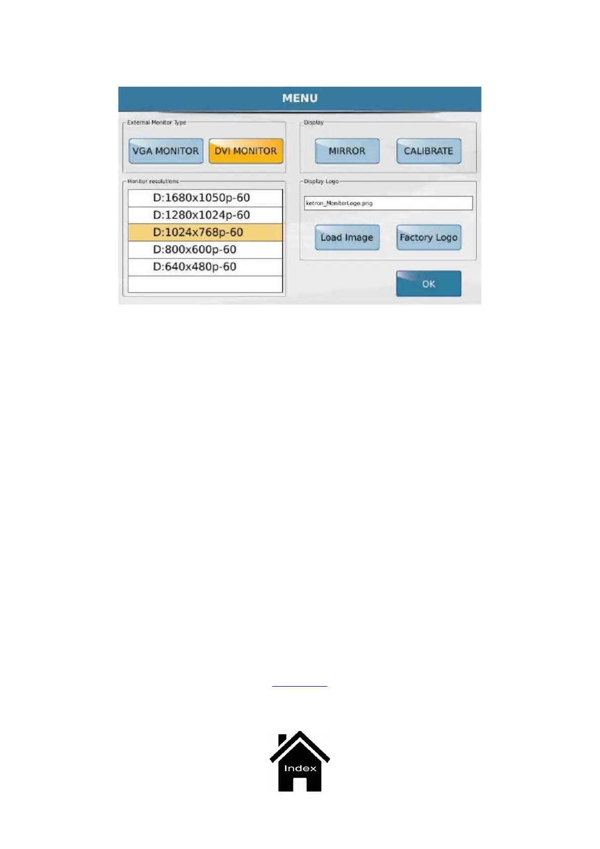 - CALIBRATE : Opens a window on which you may calibrate the Touch Screen display. Here again you