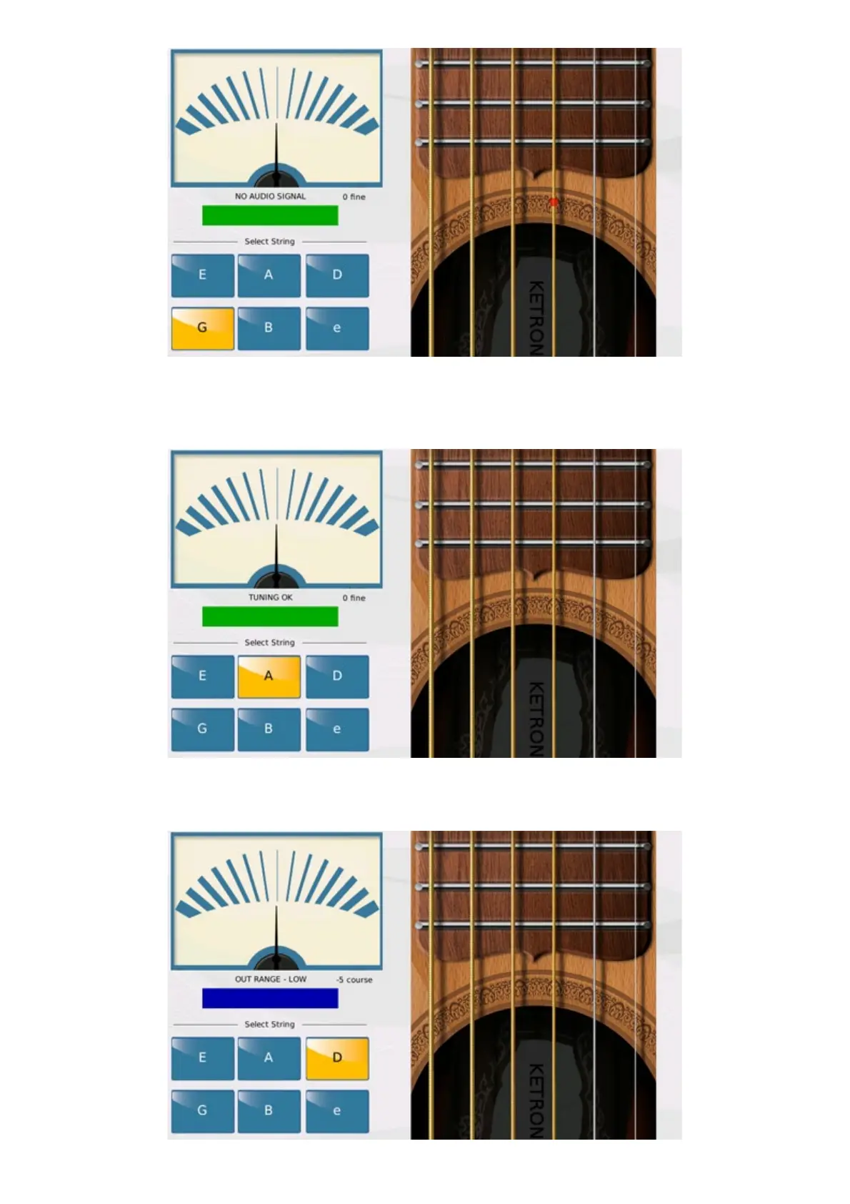 BLUE or RED colour (related of tolerance tuning) will suggest how to correct your instrument tuning.