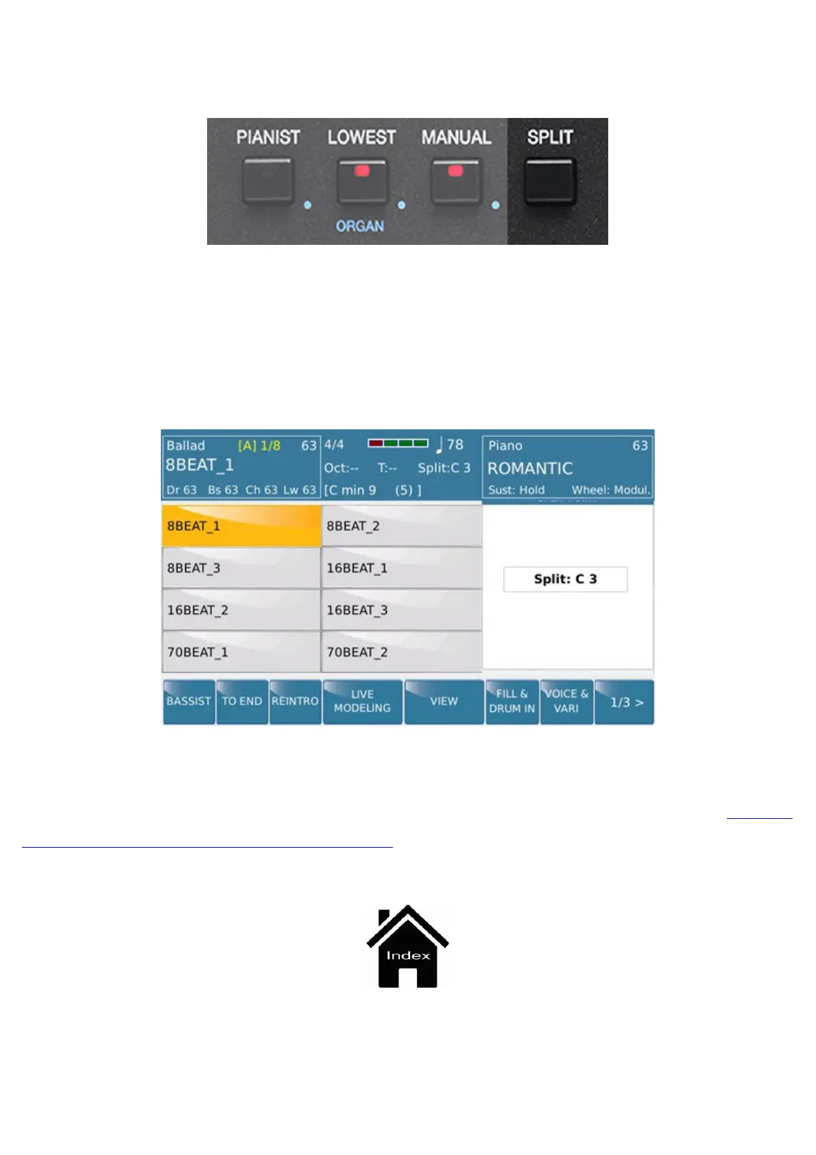 SPLIT: Selecting this tab and pressing a note on the keybed, Split area is determined from Lower section (left)