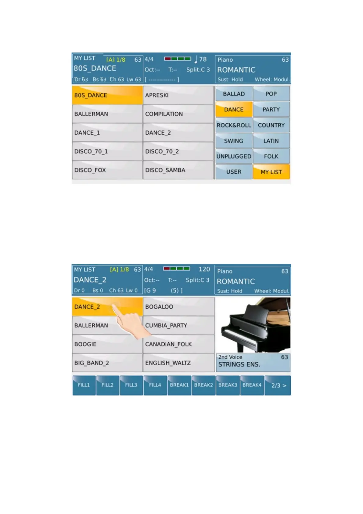 Styles. MY LIST menu allows you to allocate the Styles that use more frequently on 64 locations "ready to use".