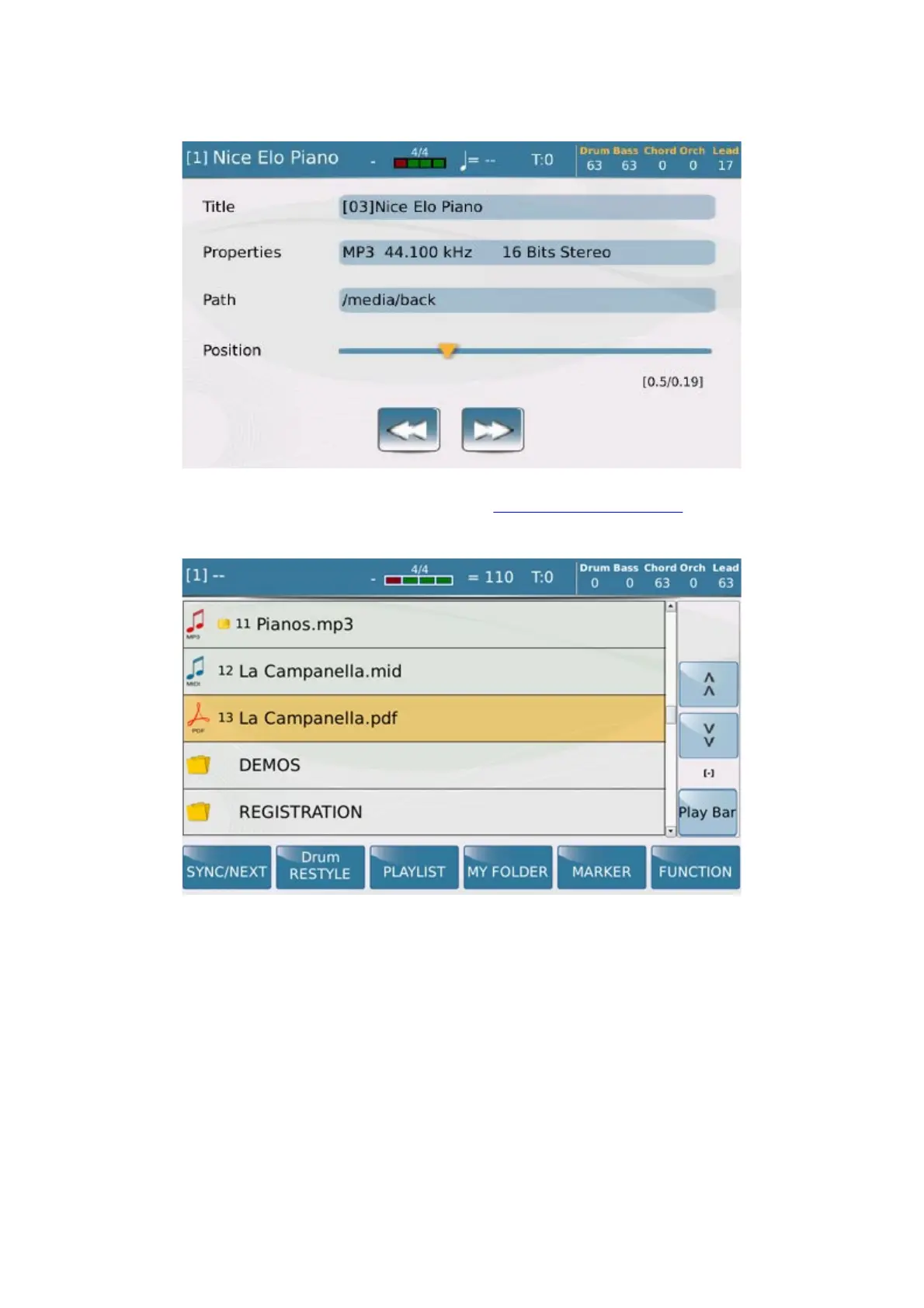 If the file contains Karaoke type lyrics, these are displayed at the centre of the screen instead of the contents of the