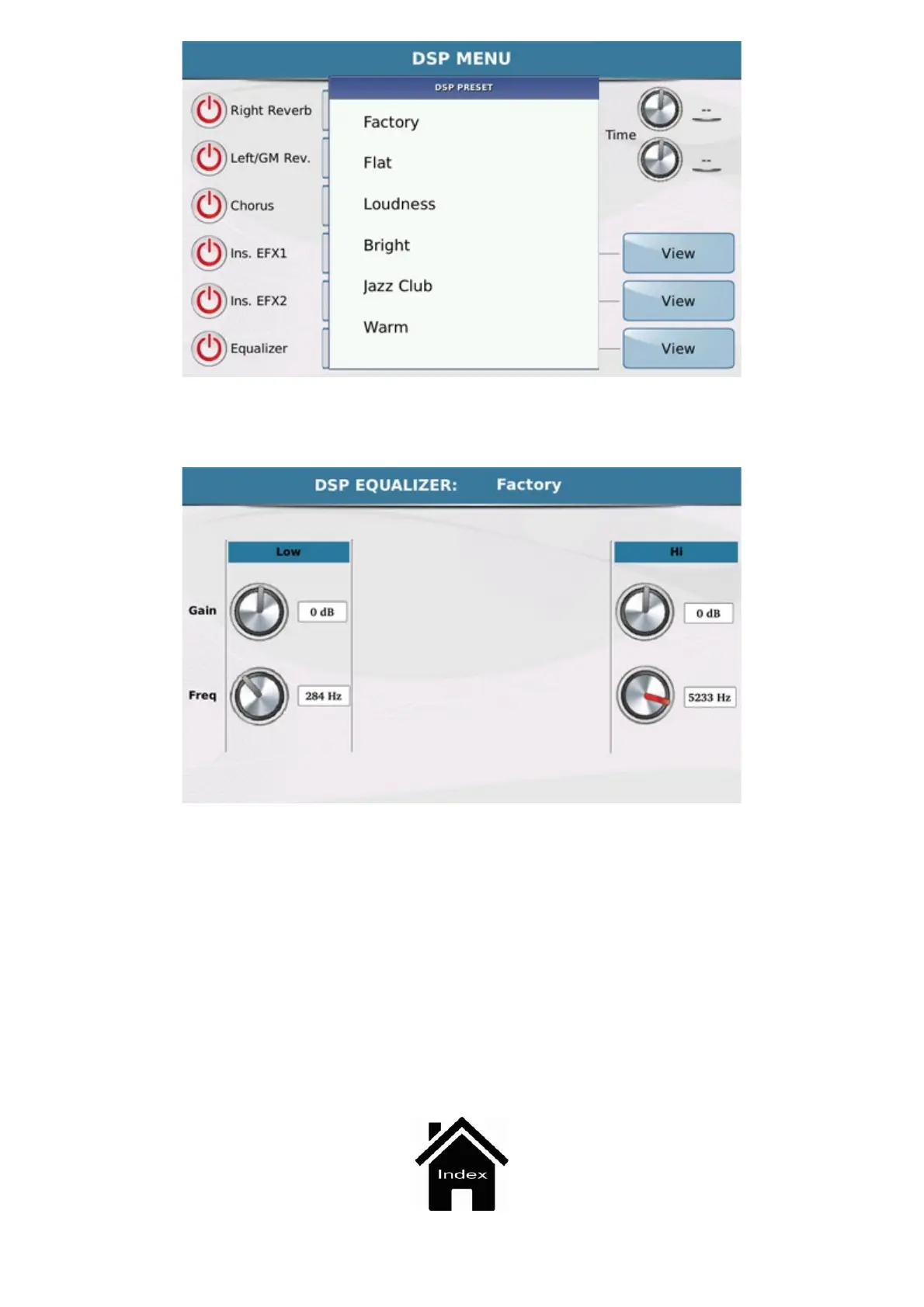 The rectangular box displays the equalisation presets available while the key View opens a screen on