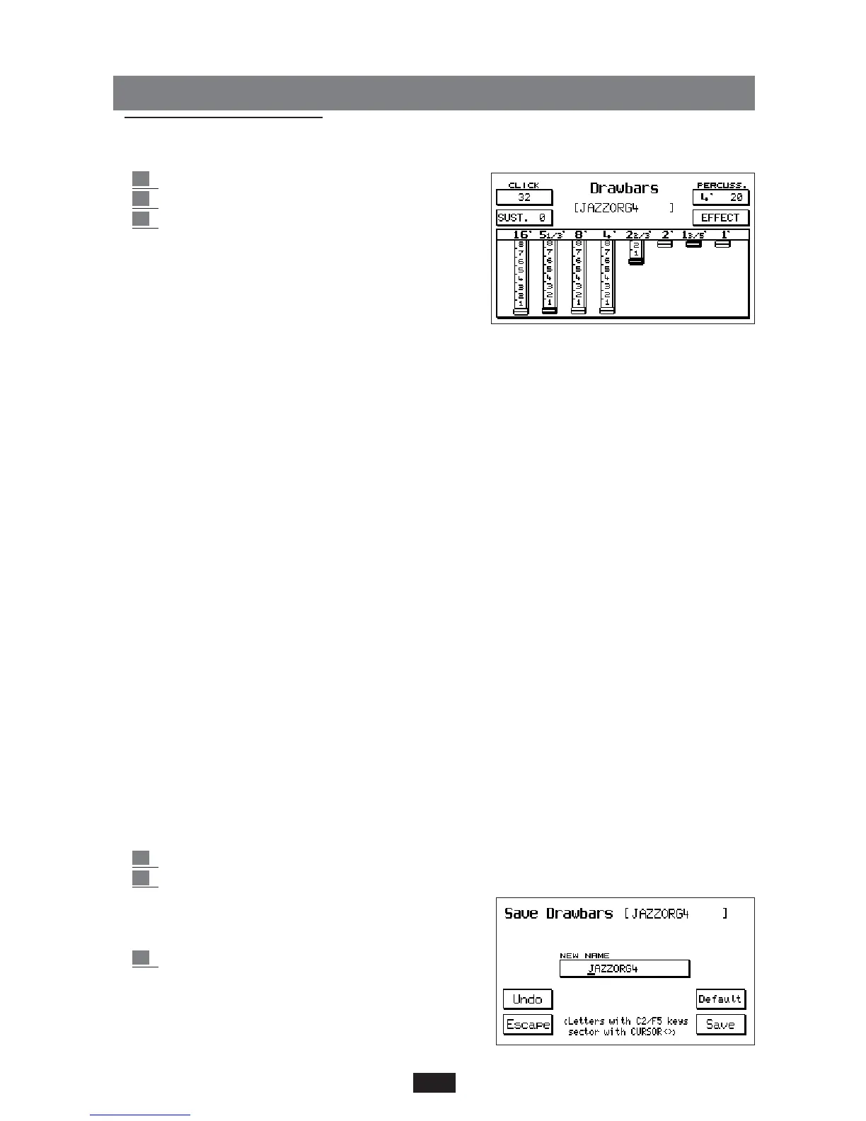 keyboard, the Drawbars section allows the user to program