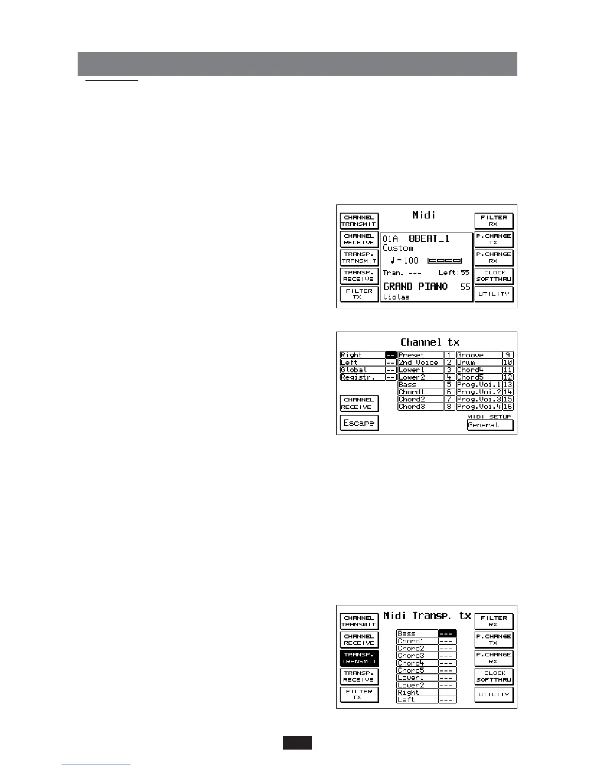 connections to external devices.The Midi Set Up are available for both the Midi Transmit section
