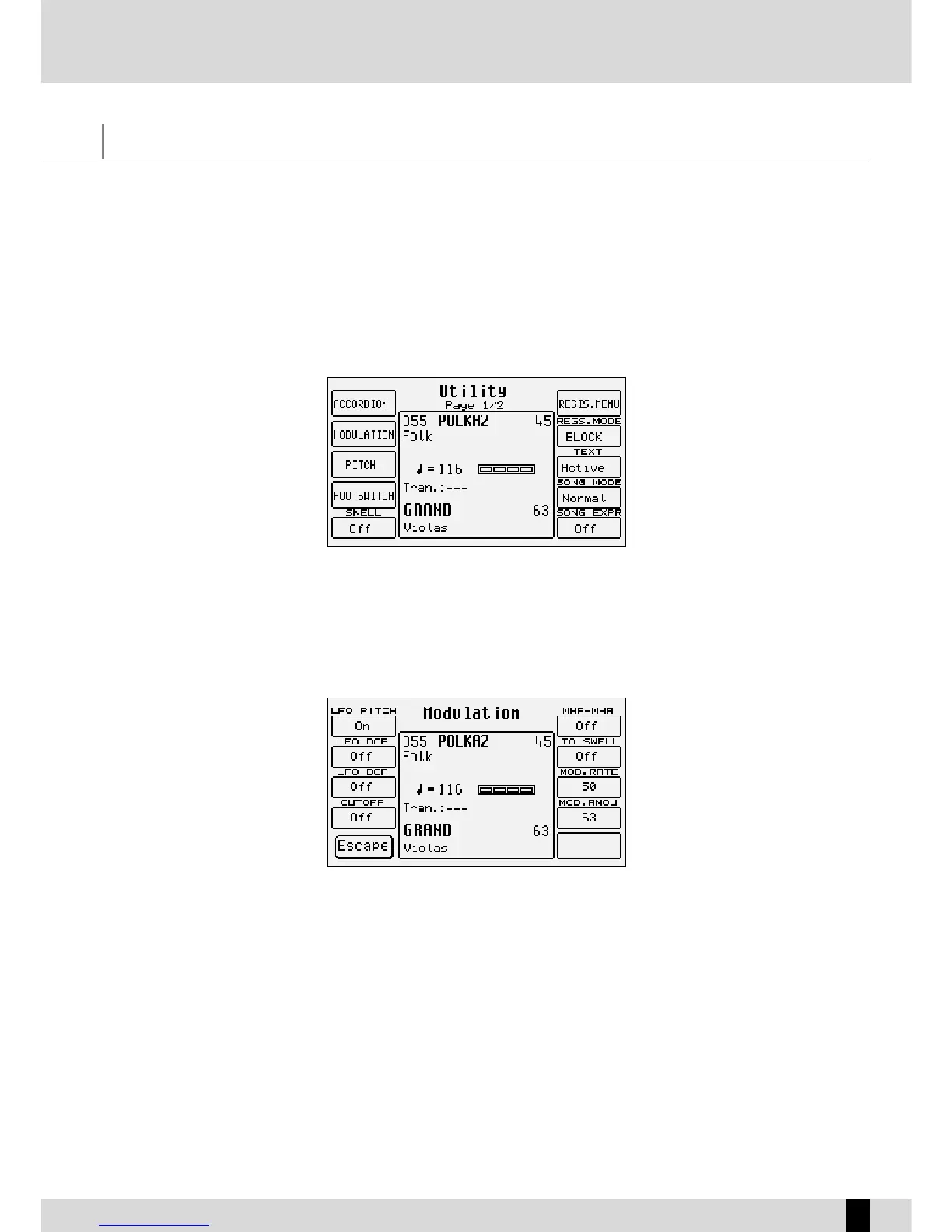 The Utility menus are used to control the physical controllers, the MIDI accordions, the pedals and a group of parameters that modify the gen-