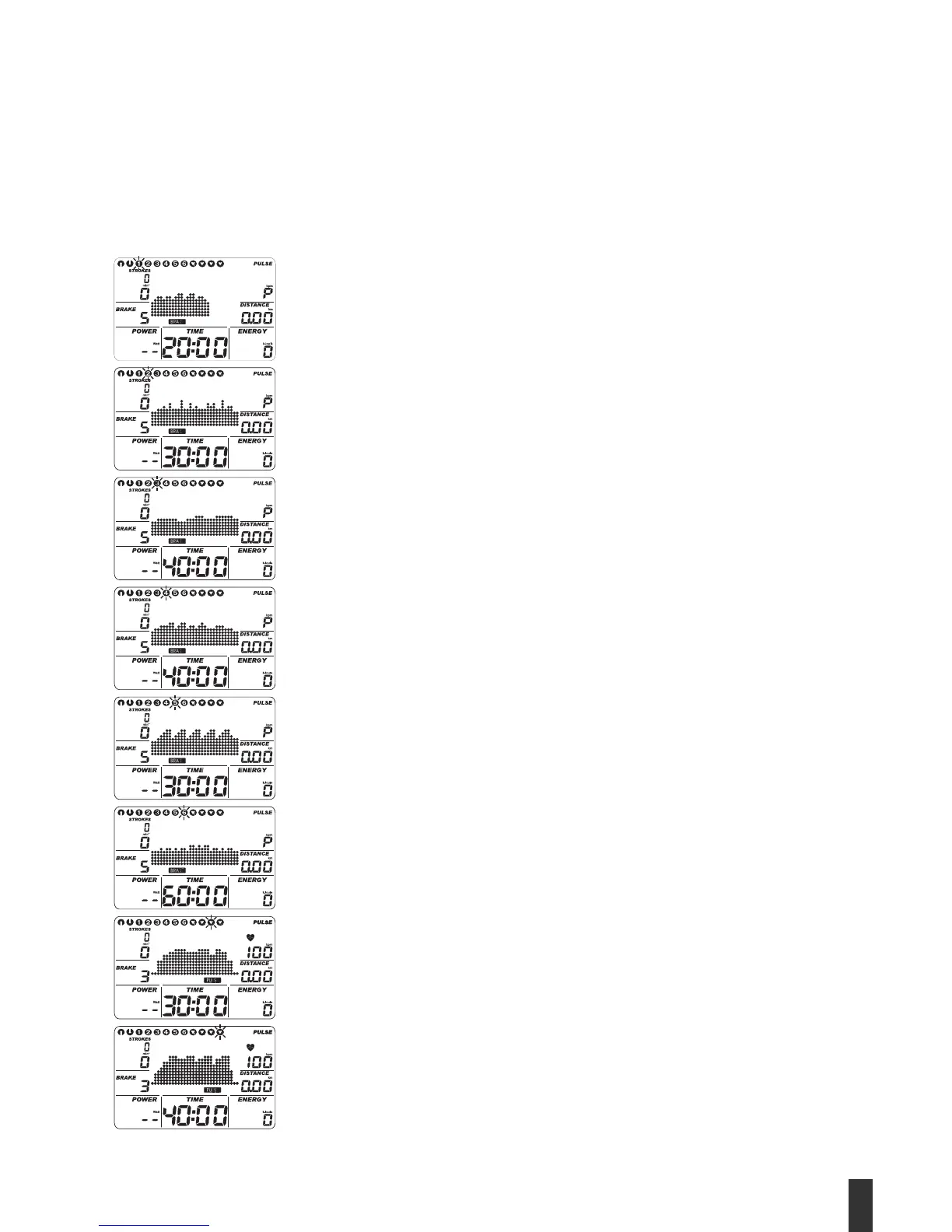 6 profili mocy jest pomyślanych dla ”treningu interwałowego 20 min”, ”Spurts 30 min”, ”redukcja wagi 40 min”, ”Fitness 40 min”,
