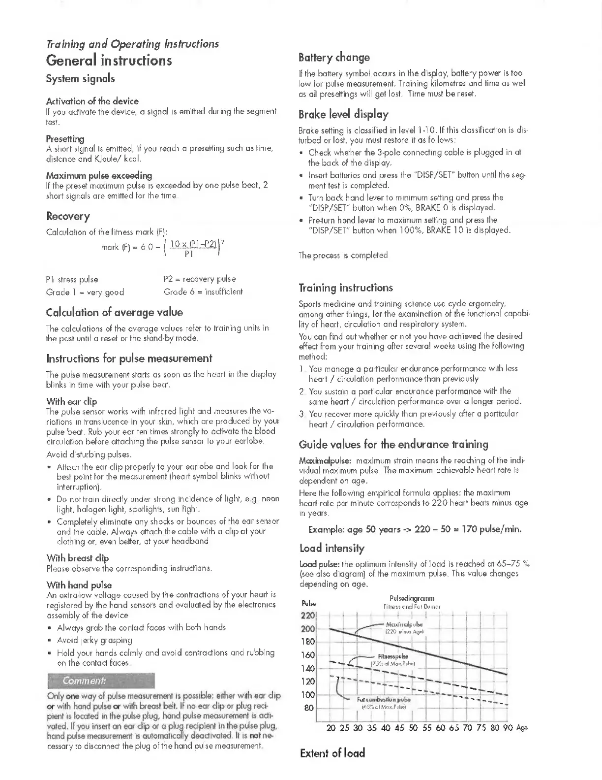 Kettler GOLF M - General Operating Instructions; System Signals and Presettings; Pulse Measurement Guidance; Brake Level and Training Advice