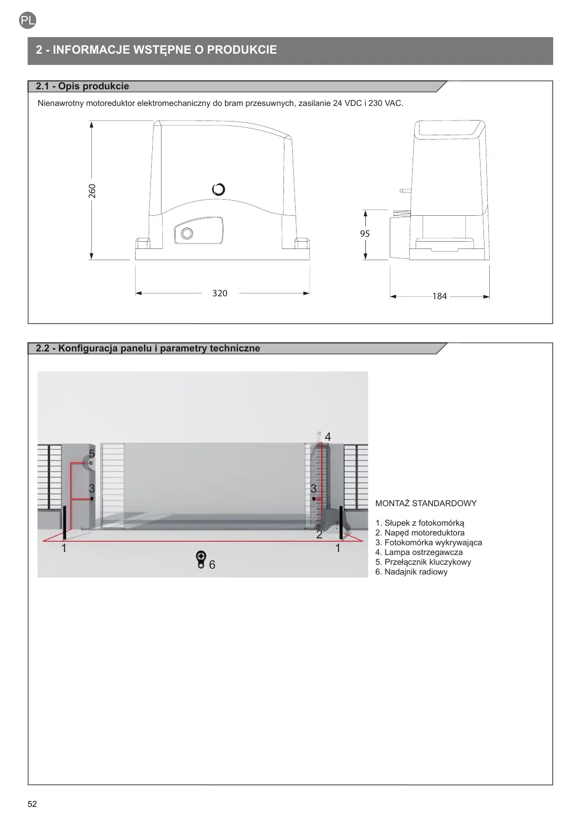 Nienawrotny motoreduktor elektromechaniczny do bram przesuwnych, zasilanie 24 VDC i 230 VAC.