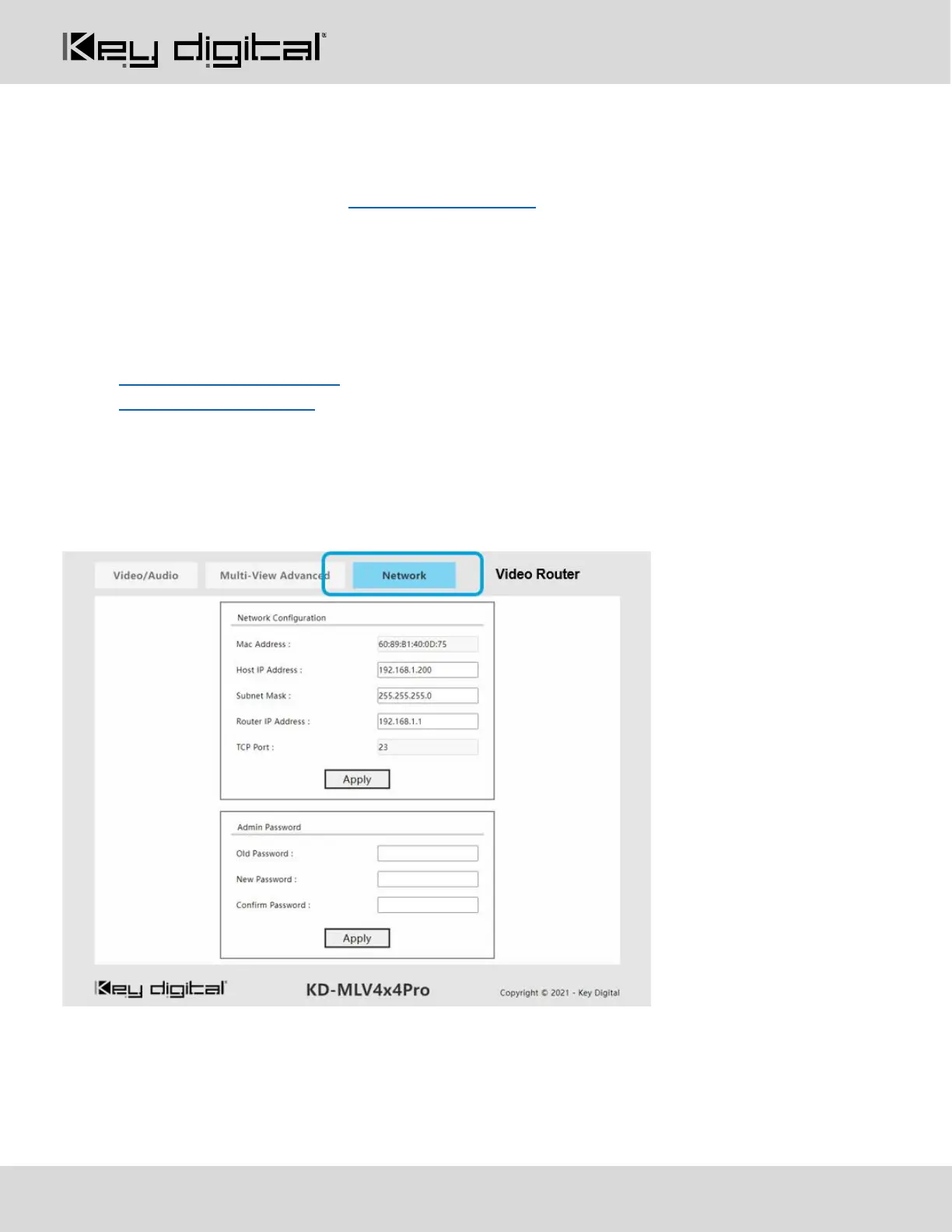 View and/or update IP settings for the KD-MLV4x4Pro.