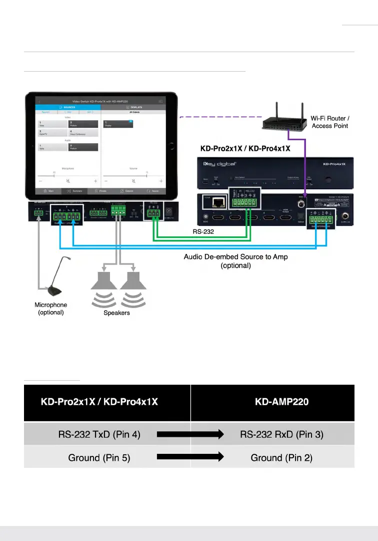KD-Pro2x1X/KD-Pro4x1X can receive TCP/IP commands and forward to KD-AMP220 via RS-232 to enable