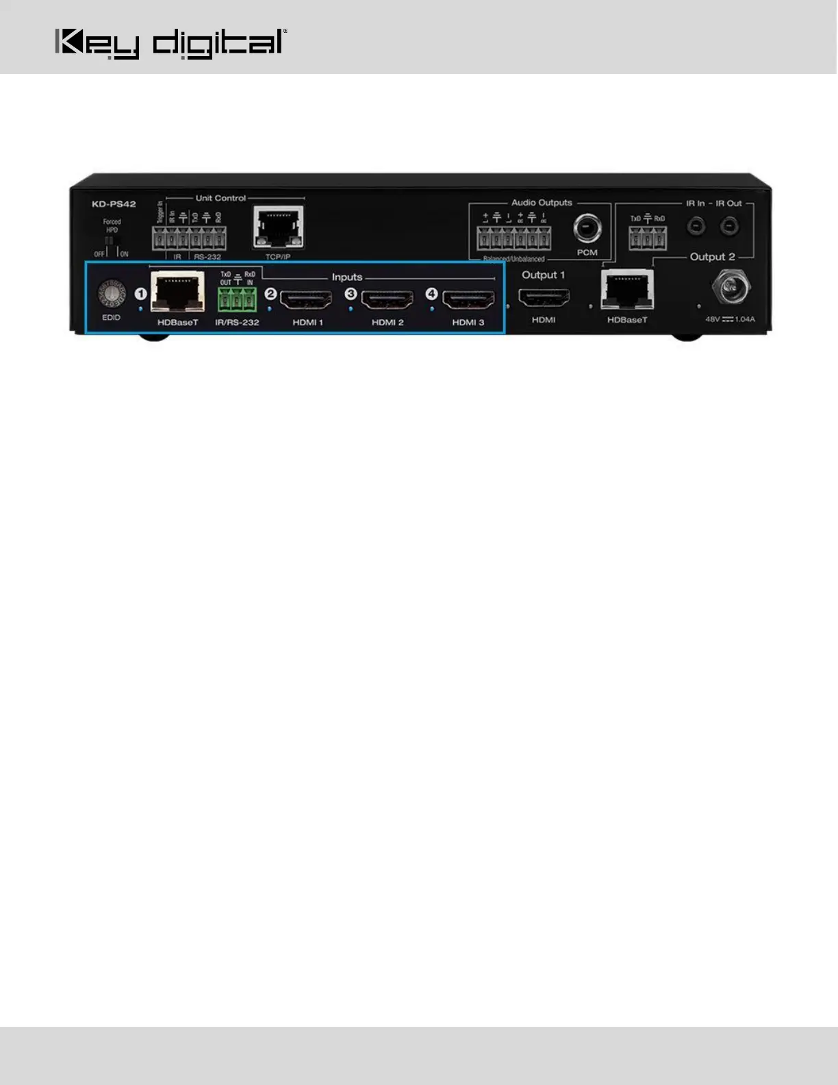 HDBaseT Port (Input 1): Using a CAT5e/6 cable, connect from a compatible KD Transmitter