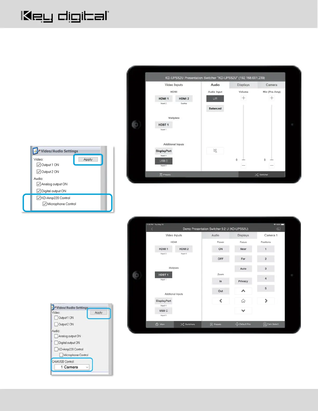 If KD-Amp220 control and KD-CamUSB mode have been activated, the Audio and Camera page tabs are