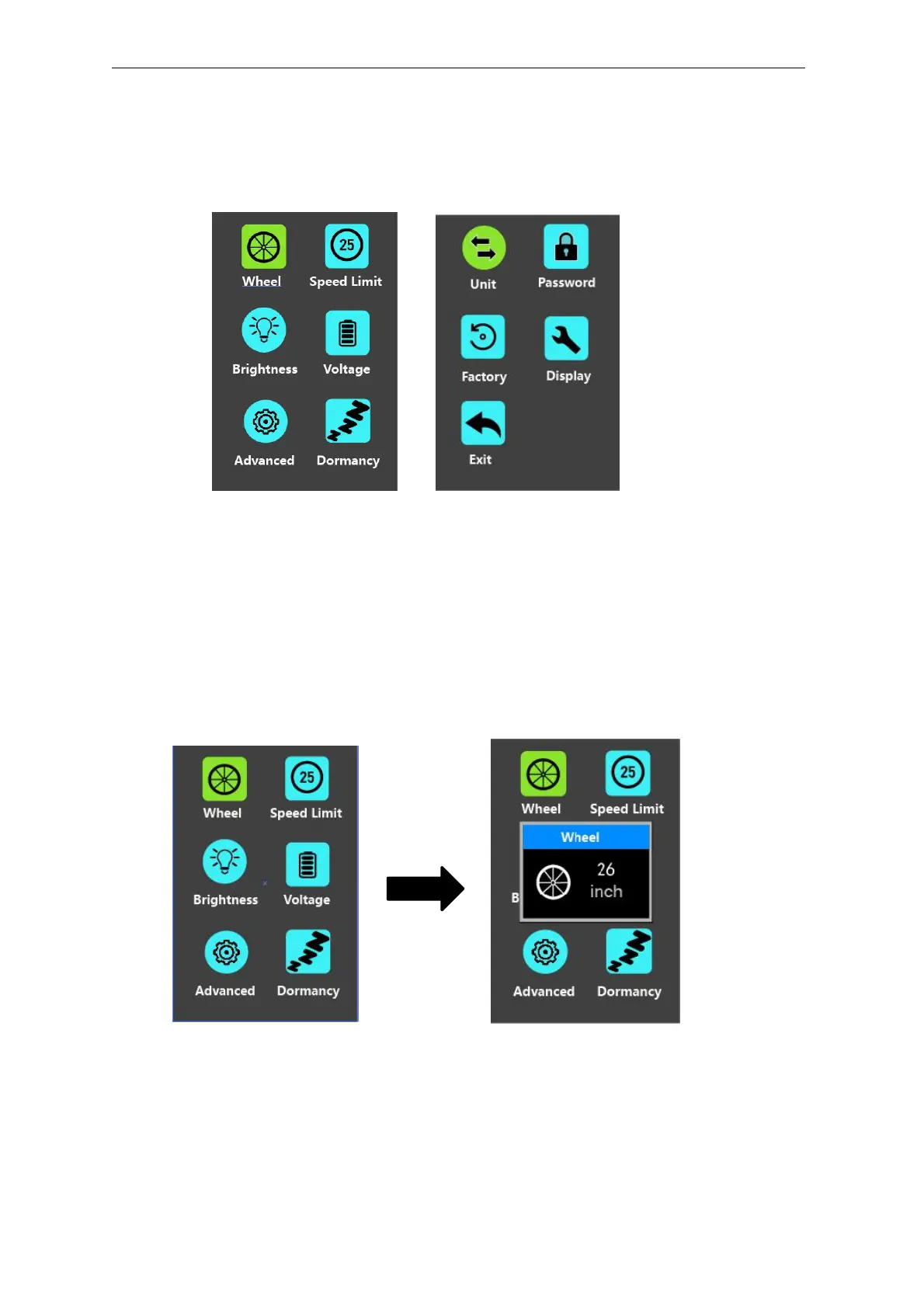 Wheel represents wheel diameter settings. To change basic settings, press the “+”