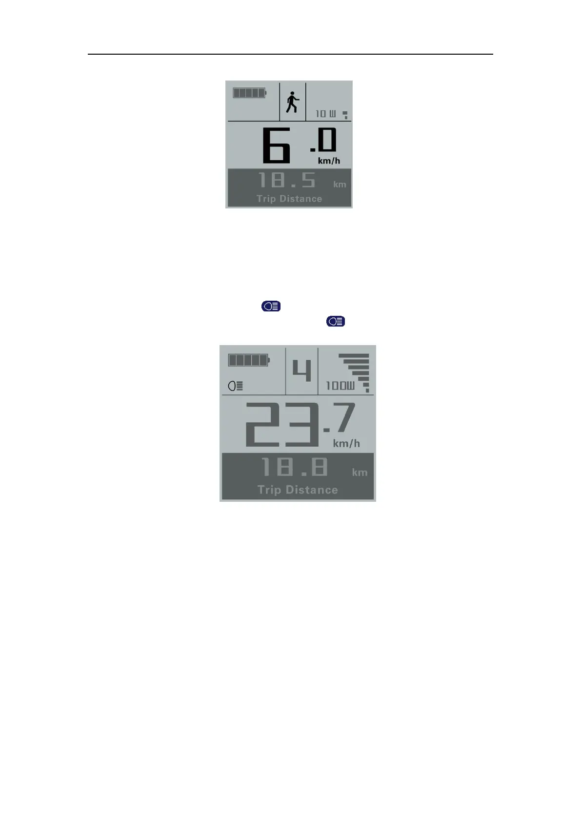 is automatically reduced. In the same way, hold the “ ” button for 2s, the bike headlight