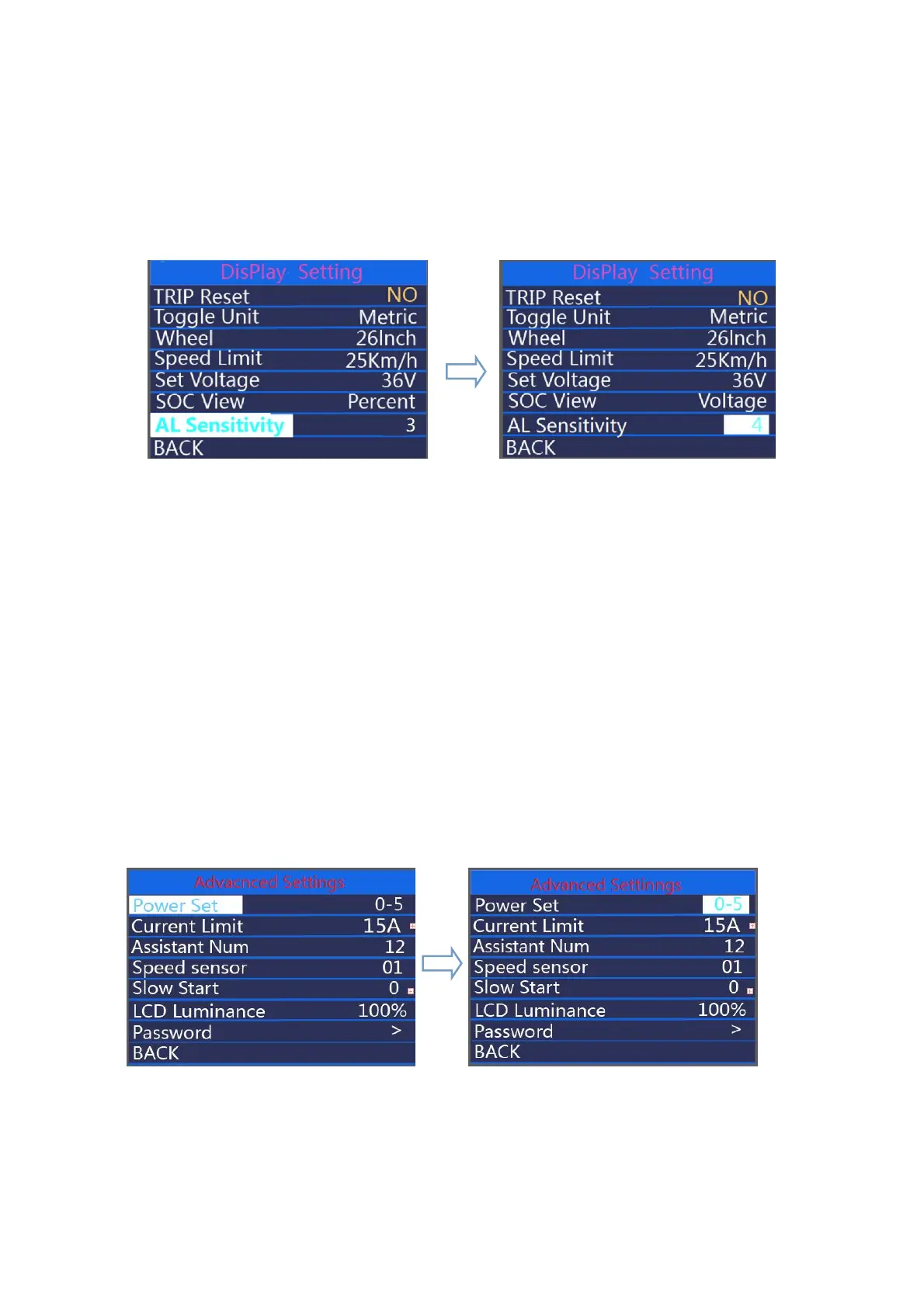 desired mode and press the “ on/off ” button to confirm and access PAS ratio settings