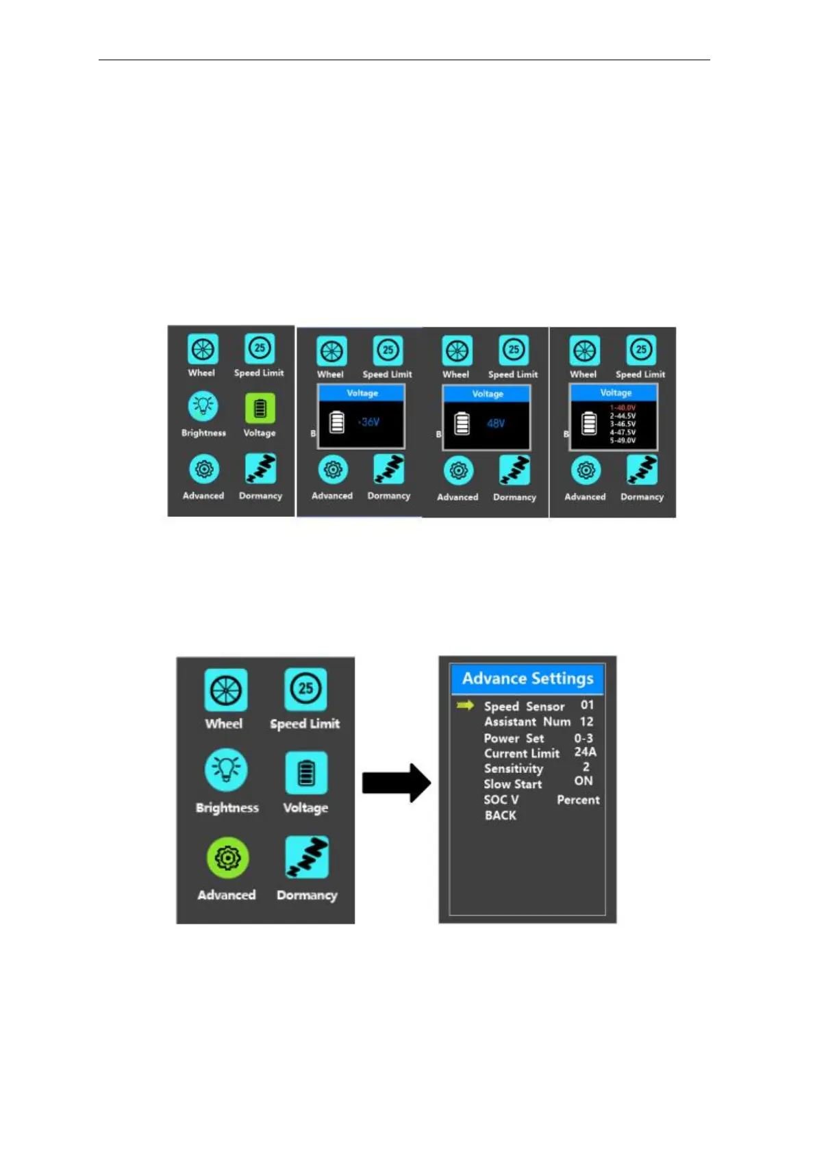 Voltage represents battery voltage segmented value settings. 36V/48V switchable.