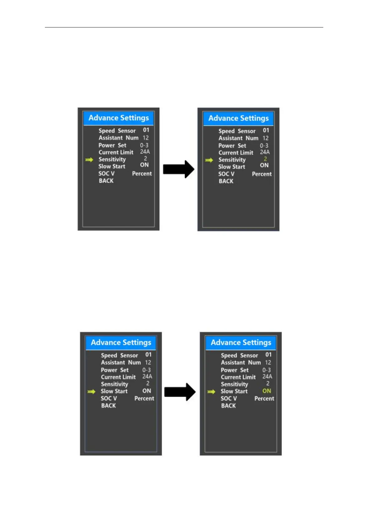 To change slow start up settings, press +/- button to choose the desired value. And press the