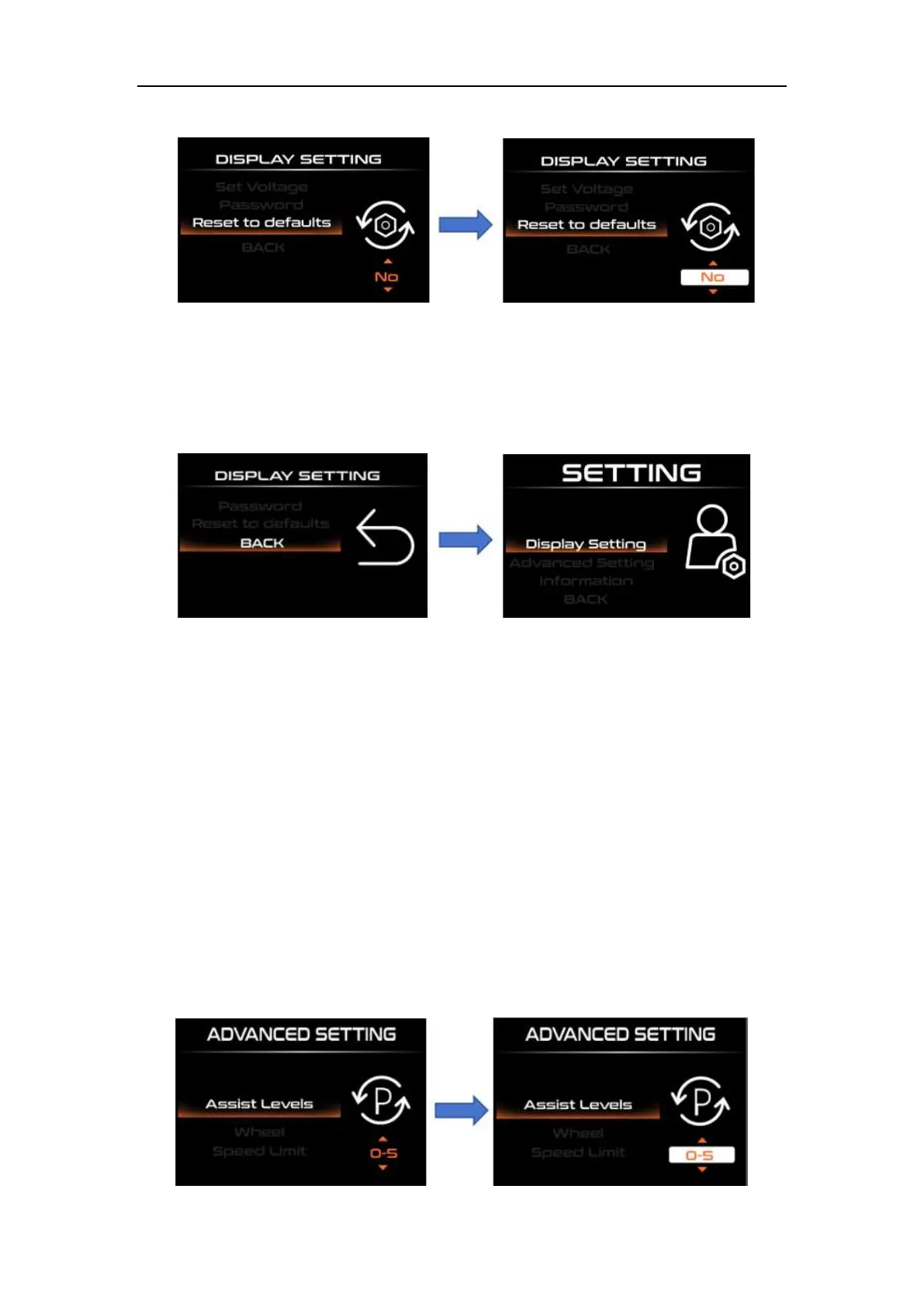 0-3, 1-3, 0-5, 1-5, 0-7, 1-7, 0 -9, 1-9. Short press "UP" or "DOWN" to change the assist