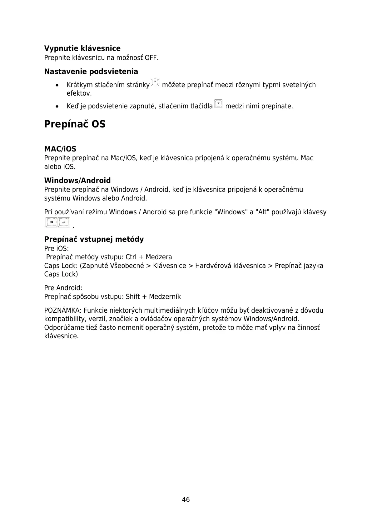 Pri používaní režimu Windows / Android sa pre funkcie "Windows" a "Alt" používajú klávesy