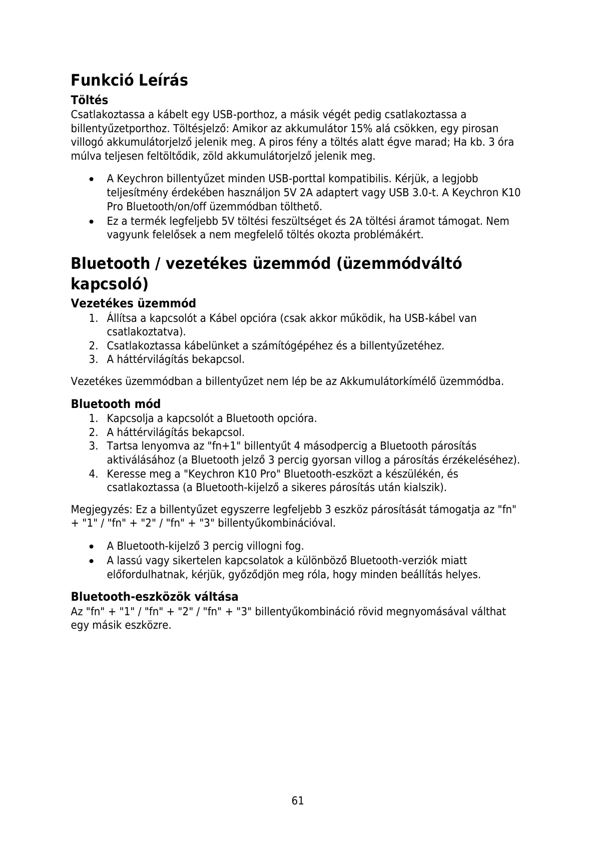 teljesítmény érdekében használjon 5V 2A adaptert vagy USB 3.0-t. A Keychron K10