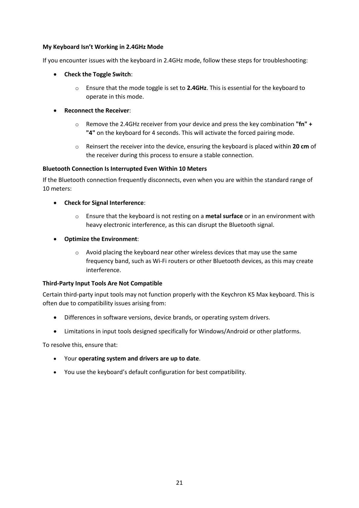 If you encounter issues with the keyboard in 2.4GHz mode, follow these steps for troubleshooting: