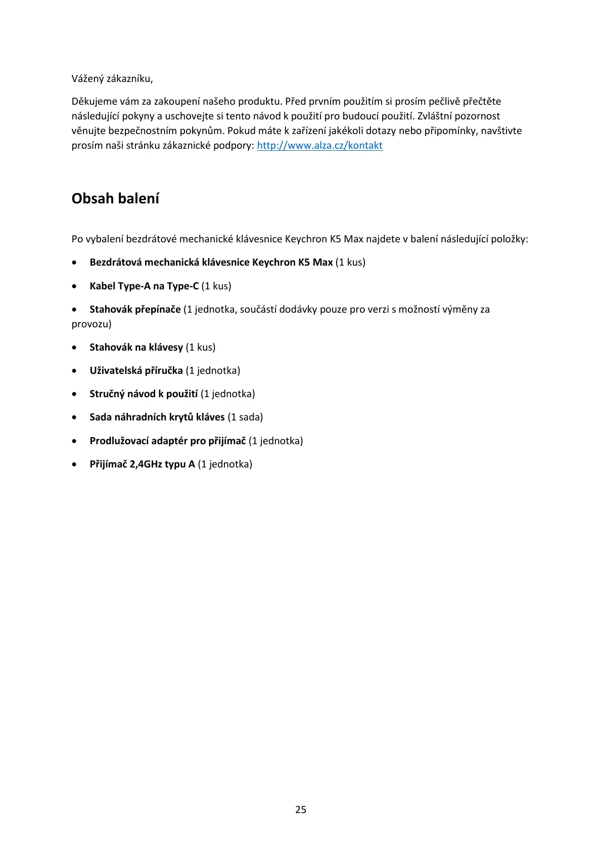 Po vybalení bezdrátové mechanické klávesnice Keychron K5 Max najdete v balení následující položky: