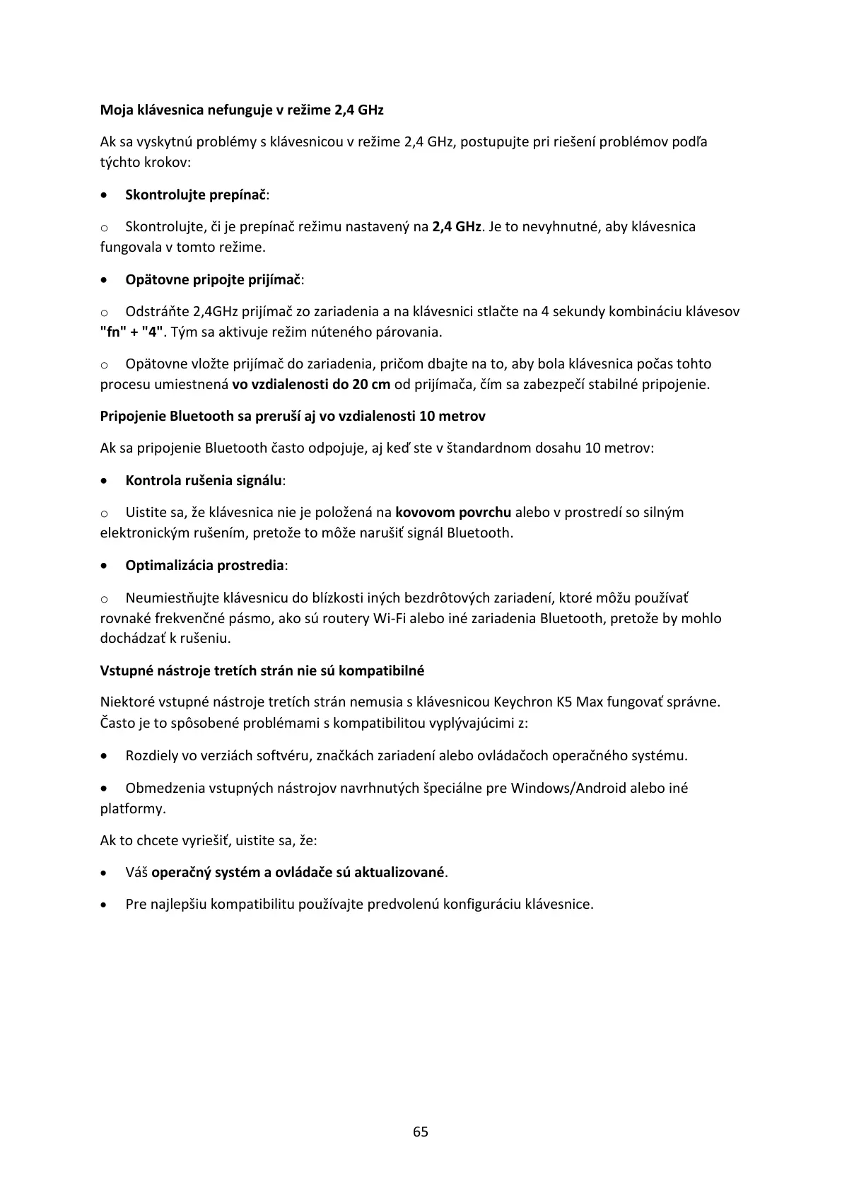 Ak sa vyskytnú problémy s klávesnicou v režime 2,4 GHz, postupujte pri riešení problémov podľa