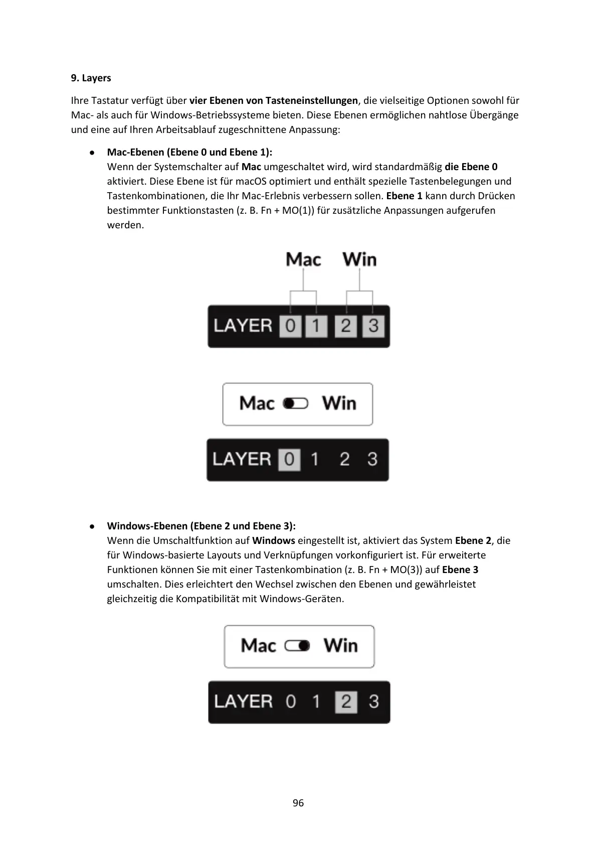 Ihre Tastatur verfügt über vier Ebenen von Tasteneinstellungen, die vielseitige Optionen sowohl für