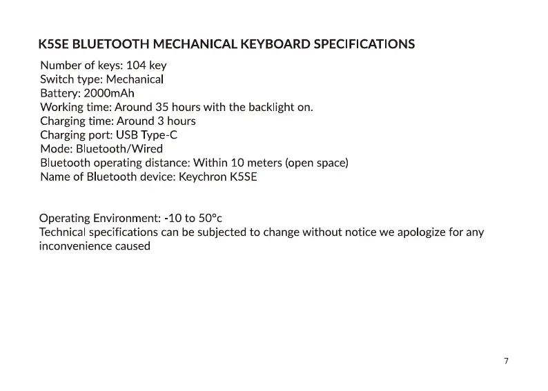K5SE BLUETOOTH MECHANICAL KEYBOARD SPECIFICATIONS