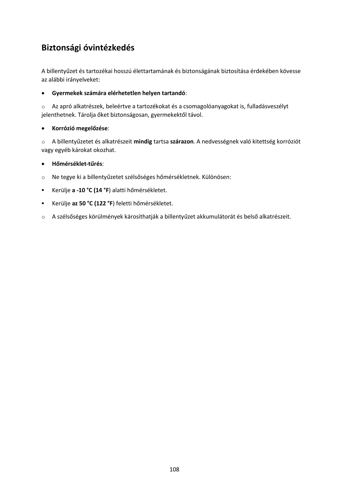 o A szélsőséges körülmények károsíthatják a billentyűzet akkumulátorát és belső alkatrészeit.