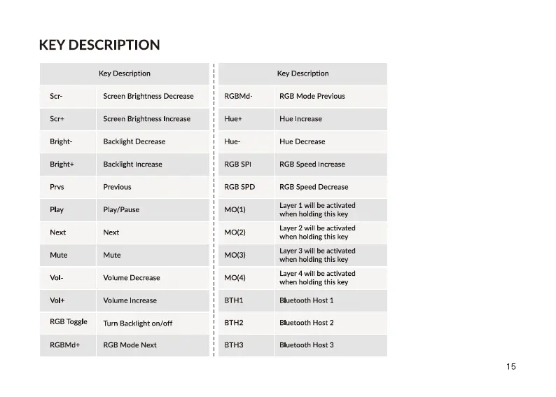 Keychron K8 Pro - Key Function Descriptions; Media and Brightness Keys; RGB and Bluetooth Host Keys