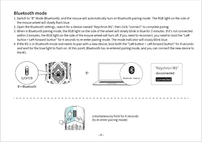 1. Switch to "B" Mode (Bluetooth), and the mouse will automatically turn on Bluetooth pairing mode. The RGBlight on the side of