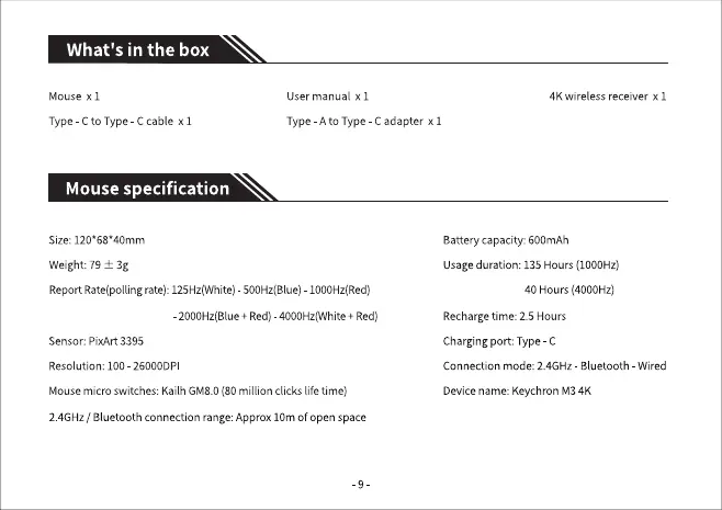 ReportRate(pollingrate):125Hz(White)-500Hz(Blue) 1000Hz(Red)